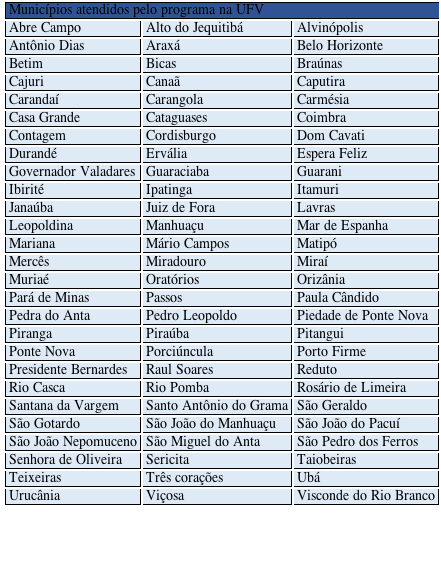 Em relação às inscrições para o curso, estas eram gratuitas e realizadas virtualmente. Os interessados realizavam um cadastro na plataforma PVANET10 e aguardavam um e-mail com as orientações e a solicitação de documentos para a efetivação da matrícula. Nesse caso, as vagas eram pré-determinadas pelo MEC, não sendo limitado o número de participantes por munícipio, somente por escola. No Quadro 1, elencam-se os municípios mineiros atendidos pelo programa.