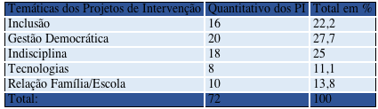 Outro tema presente nos PI é a relação Família e Escola. Foi possível perceber a hipótese de que o sucesso ou o fracasso escolar dos alunos depende, em grande parte, da participação dos pais no processo de ensino e aprendizagem por eles vivenciado, ou seja, os alunos apresentam melhor desempenho quando existe maior interação entre a família e a escola.