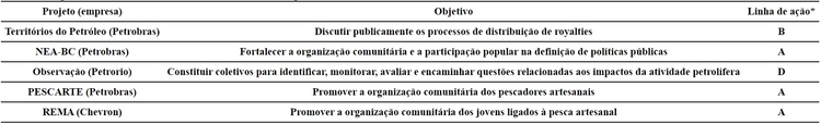 Embora os documentos analisados relatem projetos que vão na contramão das propostas da educação ambiental crítica, ponderamos que tais projetos têm a sua importância e poderiam ser oportunidades e espaços para atuação voltada para a transformação social, cabendo aos órgãos ambientais orientar as atividades, por exemplo, na integração dos projetos vinculados ao licenciamento, ou mesmo atuando na articulação com as universidades, que sistematizam informações científicas sobre a bacia do Rio Macaé. Cabe destacar que não estamos atribuindo intencionalidade na abordagem do tema, pois por mais que as empresas de petróleo se coloquem como socialmente responsáveis, essas funções não correspondem às suas atividades-fim e nem mesmo são incluídas no projeto de responsabilidade socioambiental da empresa.