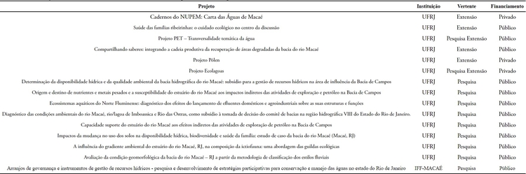 As propostas de EA vinculadas ao licenciamento municipal relacionadas no trabalho são as de inciativa da prefeitura ou de entes privados, desenvolvidas no período avaliado e informadas à Câmara Temática de Educação Ambiental do COMMADS. Com relação aos dados de pesquisa e extensão universitária, as ações foram listadas com o objetivo de fornecer um paralelo analítico em comparação com os projetos encaminhados pelas empresas. Para tanto, consideramos as ações desenvolvidas pela universidade no período entre 2010 e 2016 relacionadas diretamente à conservação, à gestão e à governança de recursos hídricos da Bacia Hidrográfica do Rio Macaé.