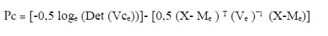 Pc = probabilidade de o vetor X ser assinalado;Vₑ = matriz de covariância da classe c contemplando todas as bandas (K,...,L); Det(Vₑ) = determinante da matriz de covariância Vc; X = vetor de medidas dos pixels desconhecidos; Me = vetor das médias para cada classe c; T =matriz transposta.