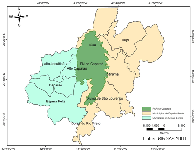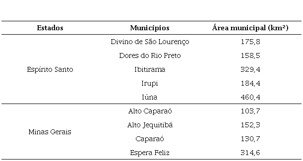 A área de estudo localiza-se entre as latitudes de 20º12’23” S e 20º46’50” S, e longitudes de 41º27’44” O a 42º5’4” O, compreendendo parte de nove municípios do entorno do PARNA Caparaó, sendo cinco municípios do estado do Espírito Santo e quatro municípios do estado de Minas Gerais. Na Tabela 1 são apresentadas as áreas oficiais desses municípios, que juntos totalizam 2.009,8 km².