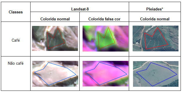 No Quadro 1 são apresentados os padrões de reconhecimento característicos das áreas de treinamento das classes “café” e “não café” nas imagens Landsat-8 (composição colorida normal e composição colorida falsa cor) e Pleiades (composição colorida normal). Verificam-se os diferentes tipos de padrões espectrais e texturais entre as duas classes das imagens, bem como as diferentes colorações e formas. As diferenças entre as colorações ocorrem porque a vegetação reflete intensamente a cor verde e o infravermelho próximo (EPIPHANIO; LEONARDI; FORMAGGIO, 1994; VIEIRA et al., 2006; MARUJO et al., 2017).