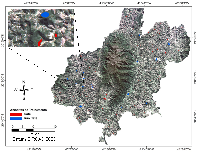 A captura das amostras da classe “café” foi feita na parte central das lavouras cafeeiras, deixando sempre uma borda para evitar a interferência dos pixels de estradas, carreadores, fragmentos florestais ou outras coberturas adjacentes aos alvos, tornando essas amostras mais homogêneas. Já na classe “não café”, as amostras foram heterogêneas, havendo simultaneamente a captura de pixels de diversas ocupações do solo como pastagem, silvicultura, fragmento florestal, mata, capoeira, curso d’água, solo exposto e mancha urbana. Em decorrência dessa heterogeneidade, as amostras “não café” puderam ser bem mais extensas do que as amostras “café”. No total, foram capturadas 136 amostras de treinamento, totalizando 39.579 pixels, que corresponderam a 8.905.400 m² ou 890,54ha.