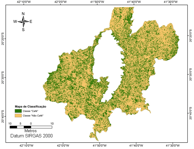 Dessa forma, a diferença entre os resultados se deve a uma confusão no processo da classificação com as demais ocupações do solo, principalmente fragmentos florestais, matas e capoeiras. Confusões semelhantes foram observadas em um trabalho de Mota et al. (2013), utilizando o sensor TM do Landsat-5, em que a área de café foi superestimada em 2,1 vezes à área real plantada.