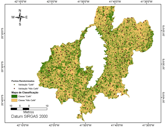 Os 400 pontos randomizados para a avaliação da classificação supervisionada estão apresentados na Figura 5. Na Tabela 5, encontra-se a matriz dos erros resultante da tabulação cruzada, tomando-se como referência as imagens orbitais disponíveis no Navegador Geográfico Google Earth. Percebe-se que os pontos randomizados abrangeram toda a área de estudo, compreendendo 200 pontos para a classe “café” e 200 pontos para a classe “não café”.