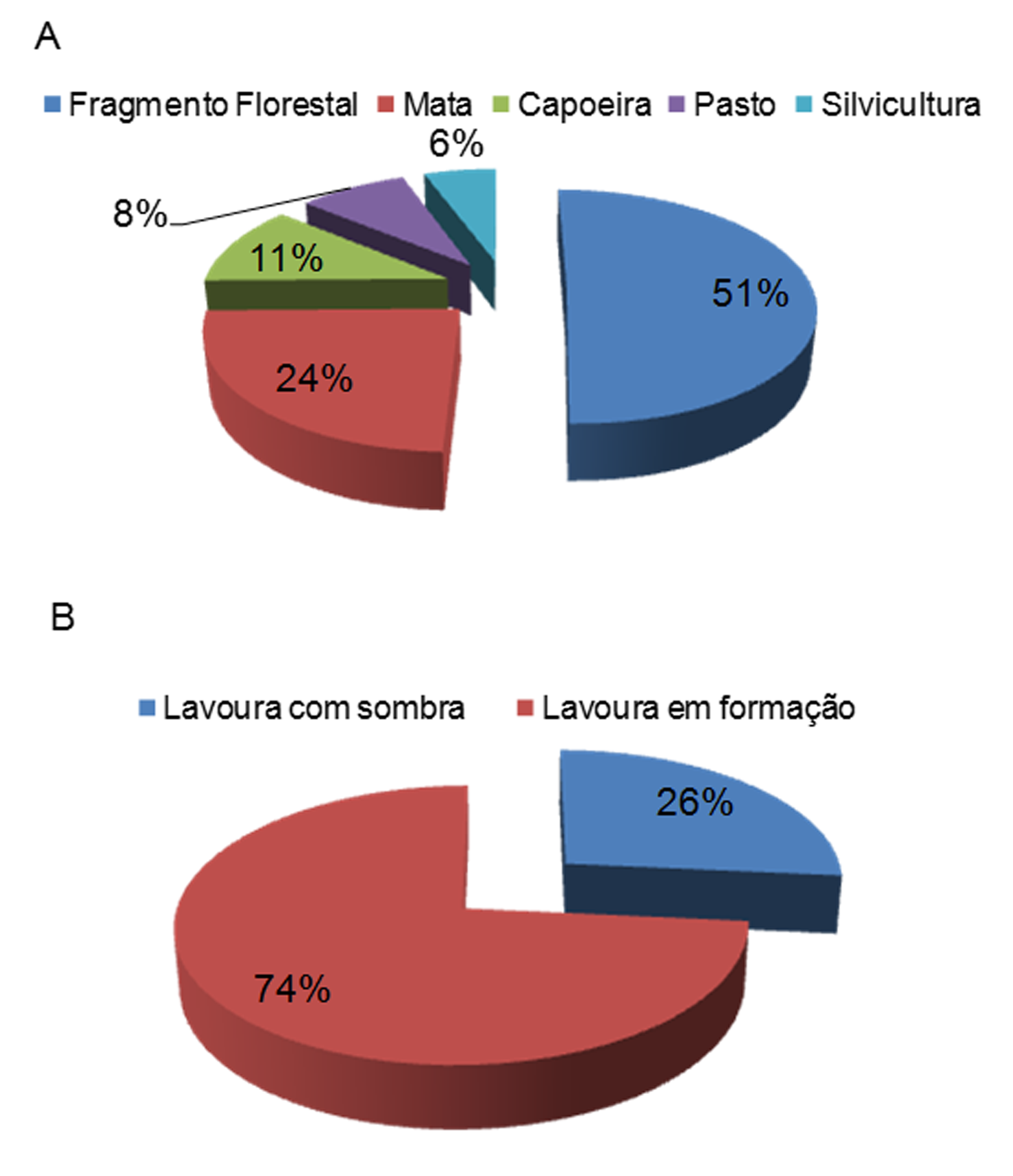 No processo de avaliação, a tabulação cruzada resultou em 93 acertos para a classe “café” e 166 acertos para a classe “não café”, ou seja, 107 confusões para a classe “café” e 34 confusões para a classe “não café”. As principais confusões encontradas na avaliação da classe “café” foram, em ordem decrescente, fragmento florestal (54 ocorrências que equivalem a 51% das confusões), mata (26 ocorrências ou 24% das confusões), capoeira (12 ocorrências ou 11% das confusões), pastagem (9 ocorrências ou 8% das confusões) e silvicultura (6 ocorrências ou 6% das confusões), como pode ser observado na Figura 6A. Na avaliação da classe “não café” as confusões foram: café em fase de formação, com 25 ocorrências, o que equivale a 74% das confusões; e sombra, com 9 ocorrências ou 26% das confusões (Figura 6B).