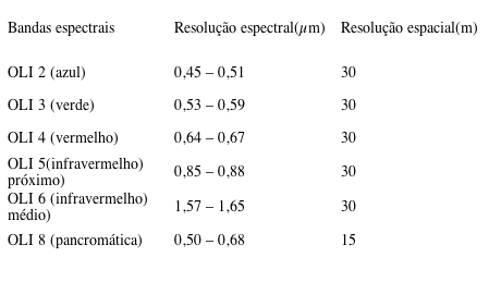 Os arquivos vetoriais dos municípios foram obtidos no site do Instituto Brasileiro de Geografia e Estatística (IBGE, 2015), o arquivo vetorial do PARNA Caparaó foi obtido no site do Instituto Chico Mendes de Conservação da Biodiversidade (ICMBio, 2015), e as imagens do sensor OLI foram adquiridas no site do United States Geological Survey (USGS, 2015). Na Tabela 2 são apresentadas as bandas espectrais utilizadas com as suas respectivas resoluções espectral e espacial do satélite Landsat-8.