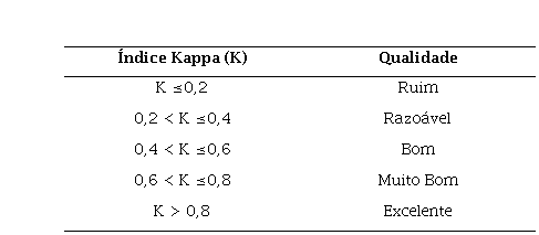 A qualidade da classificação foi feita pelos índices desempenho global (Equação 2) e Kappa (Equação 3), conforme Landis e Kock (1977) e Congalton e Green (2009). Os níveis de qualidade da classificação, conforme os valores dos índices Kappa, são apresentados na Tabela 3.