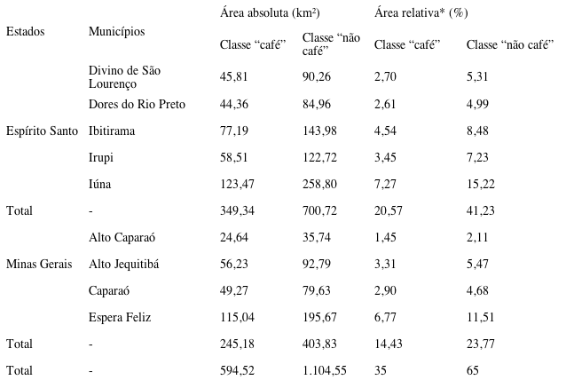 Os municípios que apresentaram as maiores áreas com café foram Iúna/ES (123,47 km²) e Espera Feliz/MG (115,04 km²); e os municípios que apresentaram as menores áreas com café foram Alto do Caparaó/MG (24,64 km²) e Dores do Rio Preto/ES (44,36 km²).