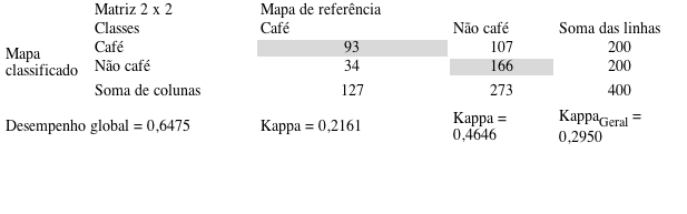 Os resultados da avaliação da classificação (Tabela 5) indicam que o desempenho global da classificação (0,6475) foi regular e o índice geral Kappa (0,2950), razoável, de acordo com Landis e Kock (1977) e Congalton e Green (2009). O índice Kappa para a classe “café” foi de 0,2161 e para a classe “não café” foi de 0,4646.