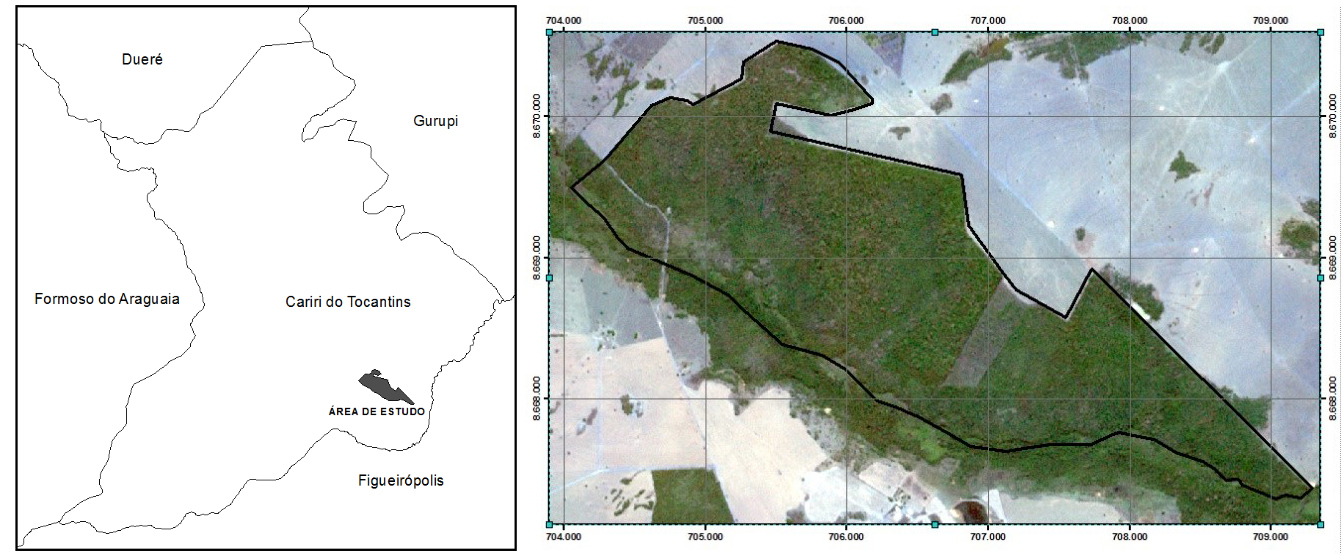 A área de estudo encontra-se localizada no município do Cariri do Tocantins (TO) e abrange uma área de um remanescente florestal de Cerrado com aproximadamente 506 ha (Figura 1). O presente trabalho teve sua etapa de campo realizada durante os dias 5, 6, 7 e 8 de fevereiro de 2015.
