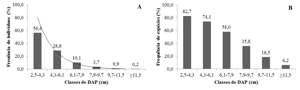 O DAP variou de 2,5 a 14,2 cm, com uma média de 4,46 cm para os indivíduos avaliados, sendo que o número de indivíduos reduz à medida que aumenta o número de classes. Apresentou-se, assim, a distribuição no formato de J-invertido com 1.494 indivíduos (56,4 %) agrupados na menor classe diamétrica (2,5 a 4,3 cm) (Figura 2A), comprovando que essa população apresenta estágio jovem pois a maioria dos indivíduos faz parte das menores classes. O padrão de distribuição dos indivíduos em J-invertido ocorre em várias formações de cerrado indicando também o recrutamento dos indivíduos nas classes seguintes para a regeneração da comunidade (ABREU et al., 2012; CASELLA; SILVA JÚNIOR, 2013).