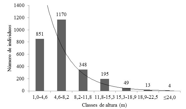 Com relação à altura dos indivíduos (Figura 3), a mediana encontrada foi de 6,6 m (mínima= 1,0 e máxima=24,0 m), cuja distribuição também apresenta tendência de formato de J-invertido, em que a maioria dos exemplares representados por 2.021 indivíduos (76,9%) foi agrupada nas menores classes hipsométricas e poucos apresentaram porte maior e/ou estavam em estágio mais avançado de desenvolvimento. Esse padrão de distribuição das alturas também foi verificado por Giácomo et al. (2013) em outra área de cerrado stricto sensu, com as três primeiras classes contemplando a maioria dos indivíduos.