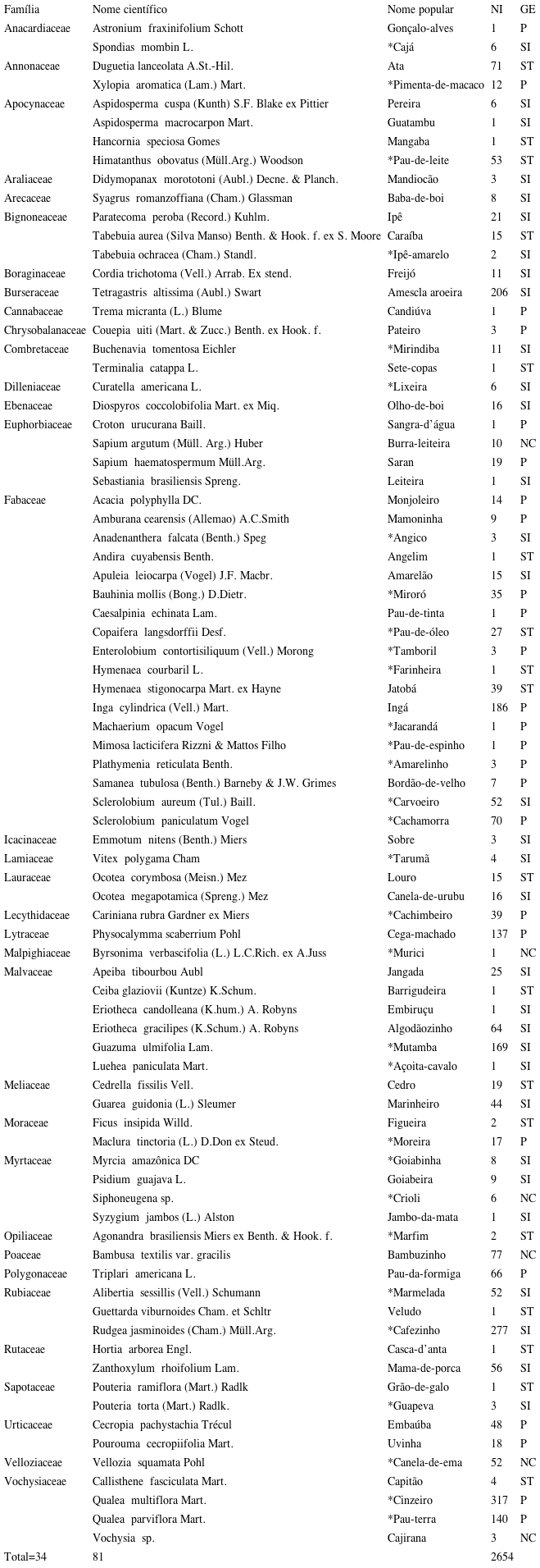 Foram amostrados 2.654 indivíduos, distribuídos em 34 famílias, 73 gêneros e 81 espécies, destas apenas duas foram identificadas até o táxon gênero (Siphoneugena sp.e Vochysia sp.), sendo também classificadas quanto ao grupo ecológico (Tabela 1). Quanto à representatividade em número de indivíduos, em ordem decrescente, foram Fabaceae (468), Vochysiaceae (464), Rubiaceae (330), Burseraceae (206), Malvaceae (261) e Lytraceae (137). Destacando-se com maior riqueza específica as famílias Fabaceae (18), Malvaceae (6), e Vochysiaceae, Apocynaceae, Euphorbiaceae e Myrtaceae, representadas por quatro espécies cada, além de 20 famílias que foram representadas por apenas uma espécie, sendo por isso consideradas raras nesse fragmento florestal.