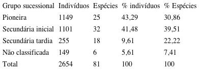 Com relação aos grupos ecológicos, as espécies foram separadas em três grupos seguindo a classificação de Gandolfi et al. (1995): a) pioneiras (P) - dependentes de luz que não ocorrem no sub-bosque, desenvolvendo-se em clareiras ou nas bordas da floresta; b) secundárias iniciais (SI) - ocorrem em condições de sombreamento médio ou luminosidade pouco intensa, ocorrendo em clareiras pequenas, bordas de clareiras grandes e bordas de floresta; e c) secundárias tardias (ST) - desenvolvem-se no sub-bosque em condições de sombra leve ou densa e crescem até alcançar o dossel ou a condição de emergente. Aquelas espécies que não puderam ser classificadas foram agrupadas na categoria não-classificada (NC).