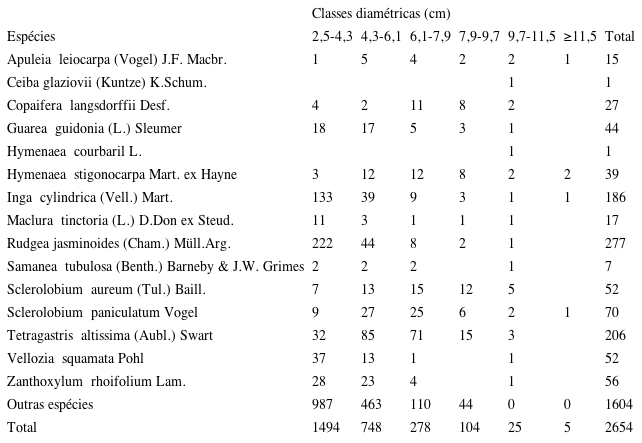 Analisando ainda a distribuição diamétrica por espécies, pode-se observar que apenas 15 apresentaram diâmetro superior a 9,7 cm, representadas por somente 25 indivíduos. Entre as espécies apresentadas, apenas cinco (Hymenaeastigonocarpa Mart. ex Hayne, Tetragastrisaltissima (Aubl.) Swart, Guarea guidonia (L.) Sleumer, Sclerolobium paniculatum Vogel e Inga cylindrica (Vell.) Mart.) mostram tendência de distribuição em forma de J-invertido. Isso sugere que os indivíduos estão se estabelecendo em pequenas proporções (Tabela 3). Entre as espécies avaliadas, Hymenaeastigonocarpa Mart. ex Hayne apresentou o maior diâmetro, com 6,93 cm de média por indivíduos.
