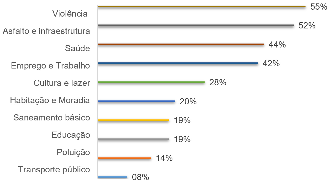 Desse modo, a violência e o asfalto/infraestrutura foram citados por mais de 50% dos respondentes, e os serviços de saúde e de geração de emprego e renda, por mais de 40%. Esses quatro problemas serviram de base para a aplicação do segundo questionário. É importante pontuar que outros problemas como a ausência de cultura/lazer e a ausência de habitação/moradia se destacaram, tendo sido lembrados por mais de 20% dos respondentes de São Sebastião da Amoreira; a ausência de saneamento básico, de educação e a poluição, cada um destes citado por mais de 10% dos respondentes, além da ausência de transporte público, que apareceu em apenas 7,8% das respostas, completam a lista dos problemas urbanos listados.
