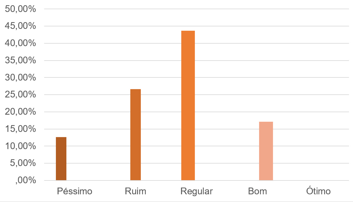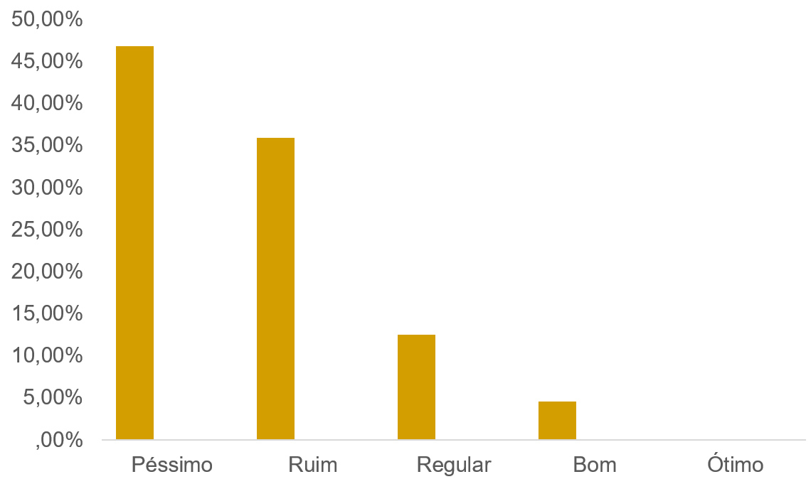 Esse problema urbano, quarto colocado no primeiro questionário, teve a pior avaliação na segunda aplicação, conforme pode ser observado no Gráfico 4, que apresenta a avaliação dos respondentes de São Sebastião da Amoreira quanto ao emprego e à geração de renda. Somando as avaliações de péssimo e ruim, chega-se a 82,7% do total; destes, quase 47% avaliaram como péssimo e quase 36% como ruim. Outros 12,5% de respondentes consideraram o serviço de saúde do município como regular, e apenas 4,6% avaliaram esse serviço público como bom.