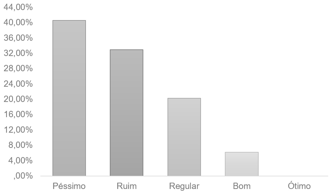 O asfalto e a infraestrutura apareceram como o segundo problema urbano mais citado no primeiro questionário, com quase 52% dos respondentes. No segundo, esse item teve também a segunda pior avaliação. O resultado da comparação entre os quatro principais problemas urbanos mostrou que, pela percepção dos respondentes, havia grande degradação do asfalto em todas as áreas da cidade e que a infraestrutura local estava aquém das expectativas dos moradores. O Gráfico 3 apresenta a avaliação da infraestrutura, principalmente a asfáltica, em 2016.