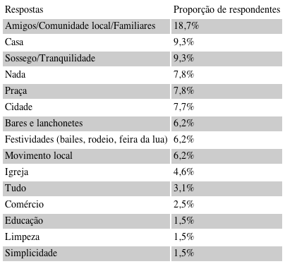 Nesses questionamentos, o respondente pôde considerar livremente qualquer aspecto. Quanto aos aspectos positivos, os amigos, a comunidade local e os familiares foram citados por 18,7% dos respondentes de São Sebastião da Amoreira, aparecendo na primeira posição com o dobro de proporção da segunda colocada. Os demais elementos foram pouco citados, mostrando a dificuldade de os respondentes pontuarem aspectos positivos. A casa e o sossego/tranquilidade apareceram, cada um, em 9,3% de respondentes. As respostas extremistas “nada” e “tudo” ficaram respectivamente com 7,8% e 3,1% dos respondentes.
