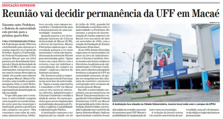 GIL, W. Reunião vai decidir permanência da UFF em Macaé. O Debate, Macaé, p. 7, 31 maio 2014. Disponível em: https://issuu.com/odebateon/docs/noticiario_31-05-14. Acesso em: 6 out. 2020.