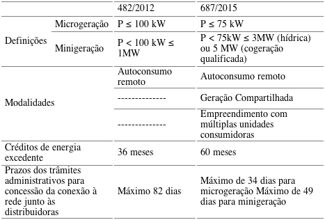 Para sanar as lacunas da RN 482/2012, foi publicada a RN 687/2015 que alterou a primeira RN. Dentre as alterações realizadas, estão a definição de microgeração1 e minigeração2 distribuídas (BRASIL, 2016c).