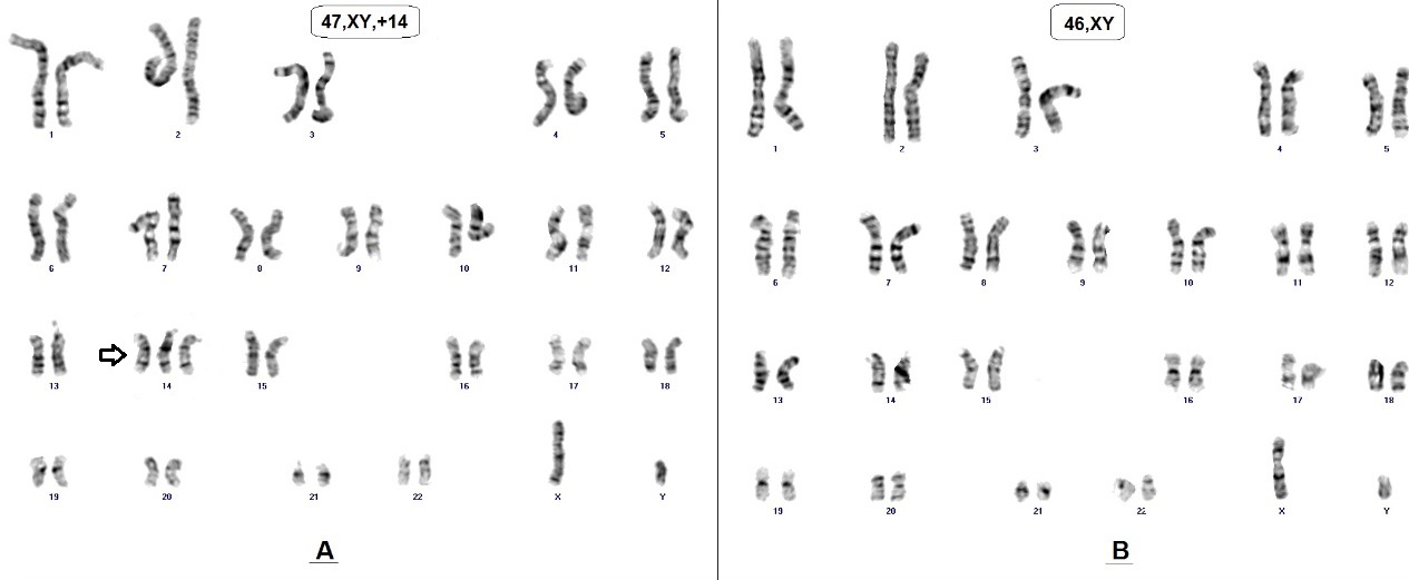 Mosaicismo dos cromossomos sexuais em baixa frequência é definido como uma porcentagem inferior a 10% de células anormais do total de células analisadas (MESCHEDE et al., 1998). Alguns autores consideram duas células com a mesma alteração cromossômica como mosaicismo de baixa frequência (SONNTAG et al., 2001). Para outros autores, uma única célula com alteração cromossômica já pode também ser considerado um mosaicismo de baixa frequência (MAU et al., 1997). A distinção entre um artefato de cultura e mosaicismo verdadeiro não é sempre fácil, e a aplicação de regras gerais associadas com o quadro clínico deve ser levado em consideração para uma tomada de decisão (ISCN, 2016). Dentre os 19 casos abordados neste estudo, dois deles foram publicados em revistas científicas. Um deles é um caso raro de trissomia do cromossomo 14 em mosaico (47,XY,+14[8]/46,XY[192]) (RODRIGUES et al., 2016), apresentando mosaicismo em apenas 4% das células, sendo a menor porcentagem já encontrada para esta síndrome juntamente com o estudo de Fujimoto et al. (1992). Interessantemente, não foi encontrada uma correlação direta entre a gravidade do fenótipo e a proporção de células com a trissomia do cromossomo 14. O primeiro caso de trissomia do cromossomo 14 foi descrito em 1970, desde então foram relatados apenas pacientes portadores da trissomia do cromossomo 14 do tipo mosaico, pois seria letal se encontrada homogeneamente em todas as células (FAGERBERG et al., 2012; FUGIMOTO et al.; 1992). Somente as trissomias dos cromossomos 13, 18, 21, X e monossomia do X são compatíveis com a vida humana em estado constitucional. Entretanto, uma variedade de aneuploidias tem sido observada em forma de mosaico. Isso inclui a trissomia dos cromossomos 7, 8, 9, 12, 14, 15, 16, 17, 20 e 22, tanto quanto a monossomia do 7, 18 e 21, cada um com variações de prevalência, porcentagem de células afetadas e caracteres fenotípicos (CONLIN et al., 2010).