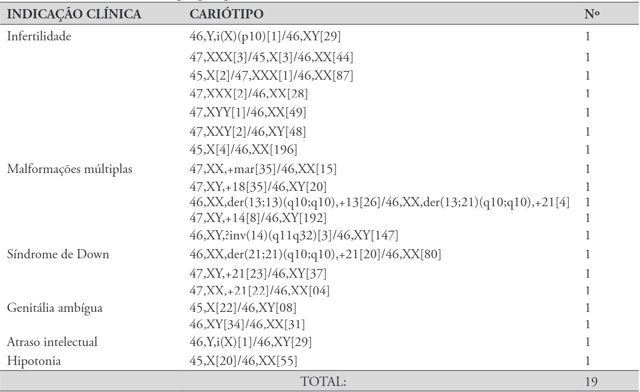 Estudos de Balkan et al. (2010) e Duarte et al. (2004) identificaram, respectivamente, 0,7% (total de 4216 pacientes) e 1,0% (total de 916 pacientes) de mosaicismo cromossômico, mostrando que nossos dados estão em concordância com a literatura. Infertilidade foi a indicação clínica mais prevalente, totalizando sete pacientes. Destes, seis foram do sexo feminino, sendo que em dois casos foram observadas três linhagens celulares (45,X[2]/47,XXX[1]/46,XX[87] e 47,XXX[3]/45,X[3]/46,XX[44]). Alterações no cromossomo sexual X como mosaicismo, translocações, deleções em Xq e outras variantes são usualmente associadas a um desempenho reprodutivo e sexual anormais, como infertilidade, abortos recorrentes e falha ovariana prematura (FOP) (GOSWAMI; CONWAY, 2005; SIMPSON, 2008; VAN DOOREN; BERTOLI-AVELLAB; OLDENBURG, 2009). A frequência de mosaicismo cromossômico do X em mulheres com a forma esporádica de FOP tem sido estimada de 3 a 11% (LAKHAL et al., 2010; WONG; LAM, 2005). Quando um número anormal do cromossomo sexual é visto em baixa frequência de células, o resultado pode ser interpretado como artefato de técnica, mosaicismo cromossômico ou relacionado à idade (RUSSELL et al., 2007; WISE et al., 2009). Assim, mosaicismo cromossômico do X em baixa frequência e sua relevância clínica ainda permanecem em debate (GERSAK; VEBLE, 2011).