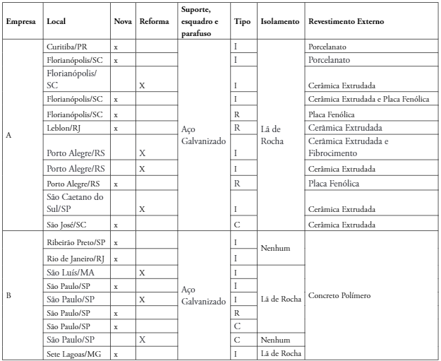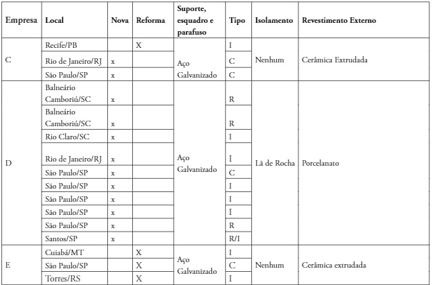 A seguir serão apresentadas as informações sobre a execução de fachadas ventiladas opacas em diferentes empreendimentos executados por cinco empresas, um total de 36 obras em 17 cidades e 9 estados brasileiros. No Quadro 4 apresentam-se os tipos de obra e materiais levantados por empresa avaliada, além da cidade onde se encontra localizada. Para a tipologia dos empreendimentos avaliados, padronizou-se com a letra C os edifícios comerciais, com R os residenciais e com I, os institucionais.