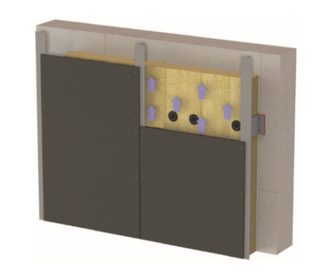 A câmara de ar é um componente da fachada na qual deve ser respeitada uma espessura mínima de acordo com a altura do empreendimento. Além disso, segundo a Associação Profissional Suíça (HANSUELI, 2014), para o bom funcionamento do efeito chaminé, a espessura mínima de 20 mm a 40 mm deve ser respeitada quando o isolamento termoacústico é instalado. Os isolamentos termoacústicos mais utilizados são a lã de vidro ou a lã de rocha, os quais têm a finalidade de garantir um melhor desempenho da edificação, tanto no conforto térmico quanto no acústico (GUIGNARD, 2010). A lã de rocha apresenta algumas vantagens (GOETGHELUCK, 2011): (a) é um material hidrófobo que colabora com a estanqueidade e controla a umidade da parede; (b) é maleável (fácil aplicação); (c) tem maior resistência ao incêndio em relação ao poliestireno expandido (EPS); e (d) apresenta menor incidência de coceira ao toque comparada à lã de vidro. Segundo Rocha (2011), na ausência do isolamento termoacústico, a distância mínima, que compreende o espaço entre o revestimento externo e o substrato, passa a ser de 80 mm.