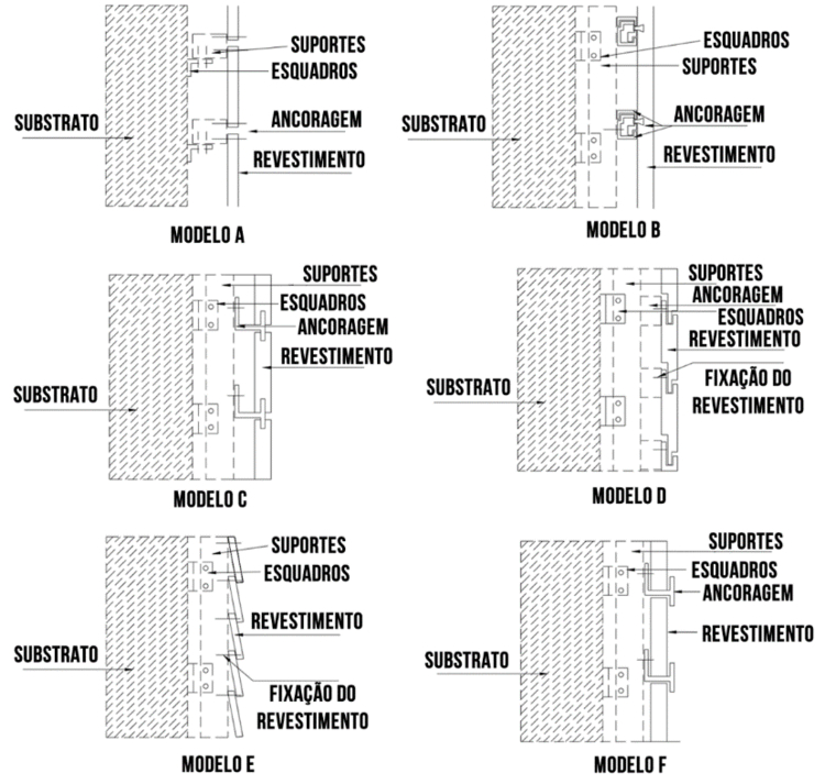Como se observa no Quadro 1, há uma variedade de materiais em todos os componentes do sistema. Diante disso, deve-se levar em conta que nem todas as combinações podem ser realizadas. A Figura 2 apresenta seis tipos diferentes de ancoragem, denominados de modelo A até F (ETAG, 2012). Vale lembrar que esses exemplos estão sem a aplicação do isolamento termoacústico e fora de escala.