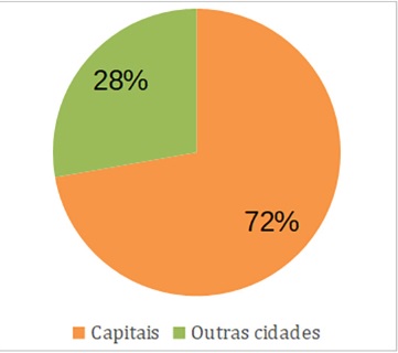 Fonte: dados da pesquisaVerifica-se na Figura 4 que a implementação do sistema de fachada ventilada opaca como fechamento vertical é realizada principalmente em capitais brasileiras, correspondendo a 72% dos empreendimentos analisados, possivelmente pela proximidade com as empresas de projeto e execução do sistema construtivo.
