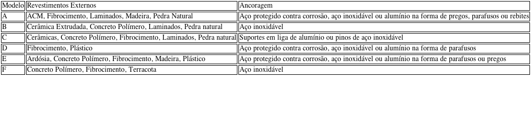 Cada tipo de revestimento externo tem um peso e uma característica própria e, dadas as diferenças dos materiais empregados, a ETAG (2012) relacionou os modelos da Figura 2 com os tipos de revestimentos externos e os tipos de ancoragens recomendados (Quadro 2).