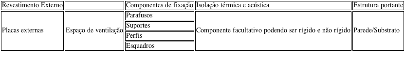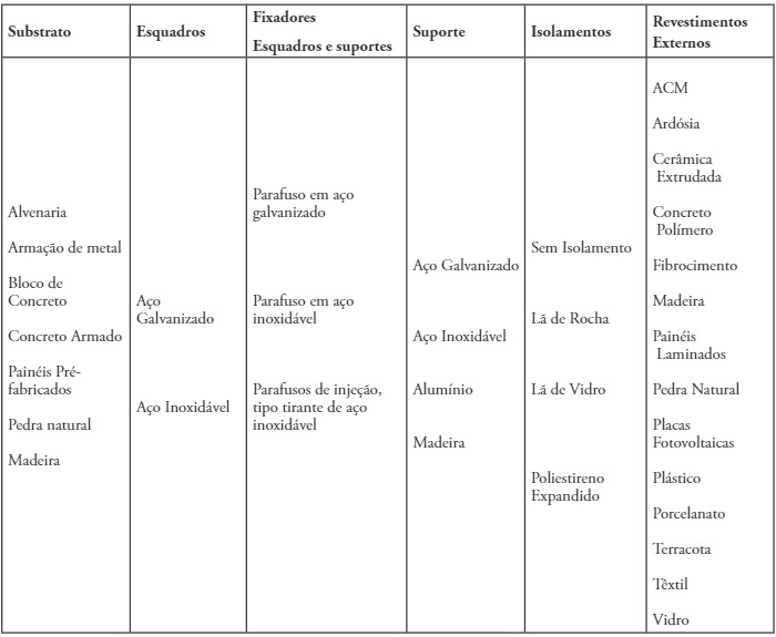 No Quadro 3 é apresentada uma composição geral de um sistema de fachada ventilada desde a parte externa (revestimento externo, componentes de fixação e isolação) até a parte interna (estrutura portante), e destacado em negrito o que foi avaliado nesta pesquisa.