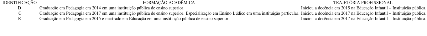 As três professoras iniciantes são formadas no curso de Pedagogia e ingressaram na carreira atuando na Educação Infantil. A PI D finalizou a graduação no ano de 2014 e no ano seguinte iniciou a atuação na docência. A PI R formou-se em 2015 e no momento da elaboração do memorial cursava o Mestrado em Educação, iniciando a docência no ano de 2017. Graduou-se em 2017 e no mesmo ano começou a atuar como professora. Além disso, cursou especialização em Ensino Lúdico. A seguir, apresentamos as narrativas das professoras.