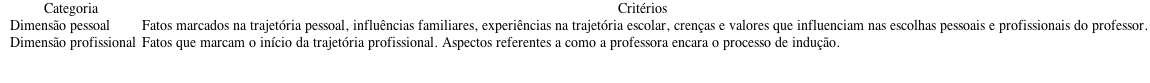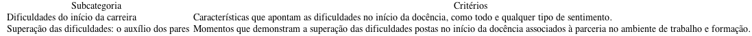 Nos quadros a seguir apontamos as categorias, subcategorias e seus critérios de análise: