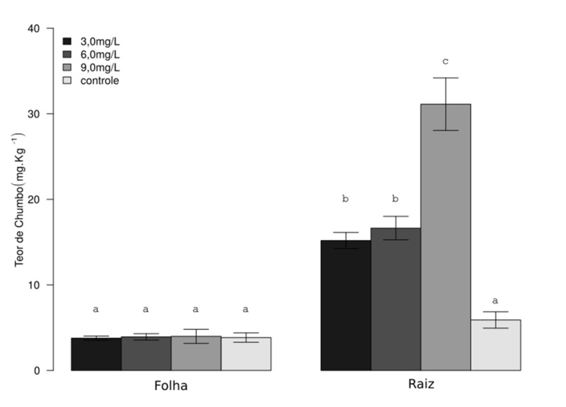 Observa-se na análise das plantas controle que, tanto nas raízes (5,90 mg.kg-1) quanto na parte aérea (3,84 mg.kg-1), há uma quantidade mínima inicial de Pb. Segundo Guilherme et al. (2005), esse elemento pode ocorrer naturalmente nas plantas, seus valores usuais são da ordem de 5 a 10 mg.kg-1 de massa seca, e os limites de toxicidade variam de 30 a 300 mg.kg-1 de massa seca. A concentração de Pb encontrada nas plantas controle pode ser proveniente do ambiente no qual foram coletadas, uma vez que a simples lavagem com água corrente não é capaz de retirar substâncias adsorvidas às folhas, tampouco às raízes.