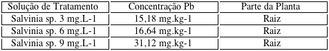 Com exceção da espécie C. ensiformes estudada, que foi considerada uma planta hiperacumuladora de Pb, as concentrações acumuladas nas demais plantas citadas mostram-se coerentes com as encontradas no presente estudo. Dessa forma, a Salvinia sp. também pode ser considerada uma planta bioindicadora ou até mesmo fitorremediadora de Pb em ambientes aquáticos (ROMEIRO et al., 2007).