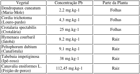 Por outro lado, o desenvolvimento de Canavalia ensiformes L. (Feijão-de-porco), na presença de Pb nas concentrações de 0, 100, 200 e 400 mmol.L-1, foi avaliado por Romeiro et al. (2007). A C. ensiformes foi considerada uma planta hiperacumuladora de Pb, devido à alta concentração – 112,45 mg.kg-1 – encontrada na raiz (Tabela 2).