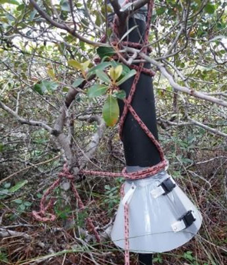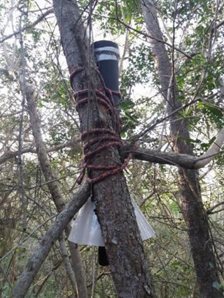 Nas figuras 9 e 10 é possível verificar a forma como o equipamento foi instalado, com o microfone voltado para baixo para protegê-lo da chuva, fixado com corda à vegetação, para evitar seu movimento e pancadas em galhos, o que poderia gerar ruídos desnecessários. Na Restinga do Piano o EA-1 foi instalado a aproximadamente 1,70 m do solo e na Restinga do Foguete, por volta de 40 cm do solo. Para a altura em que o equipamento foi instalado, levou-se em conta a altura da vegetação encontrada nos locais: na primeira área o equipamento foi instalado em uma árvore com mais de 3 m (Casuarina sp.) e na Restinga do Foguete o EA-1 foi fixado em uma moita de vegetação nativa, um arbusto de aproximadamente 2 m de altura.