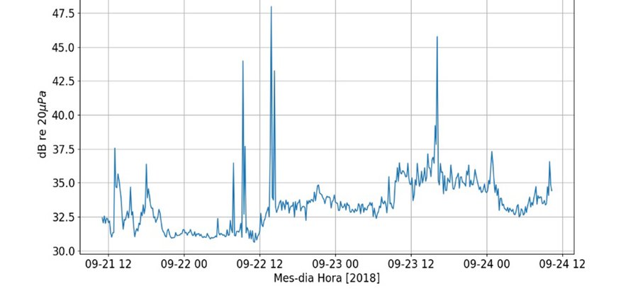 Também foi possível analisar a variação da potência média na faixa de 0,1 kHz a 1,5 kHz no período de 21 a 24 de setembro de 2018, na Restinga do Foguete, como mostra a Figura 11. Como os áudios evidenciaram maior ocorrência de antropofonia e geofonia na faixa selecionada, nota-se que os picos (dB) se relacionaram, na maioria das vezes, a essas duas fontes de sinal.