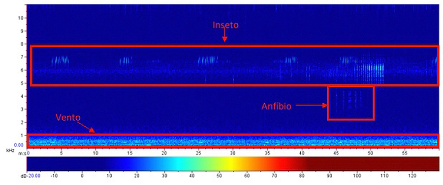 No dia 16 de julho de 2018, às 16:35h, na Restinga do Piano, foram detectados ruídos de insetos entre 4,5 e 7,5 kHz, de anfíbios entre 2 e 4,5 kHz e o som do vento na faixa até 1 kHz aproximadamente, como pode ser observado na Figura 12, através de seu espectrograma, no qual a frequência é dada pelo eixo y, o tempo pelo eixo x e a cor indica a potência média.