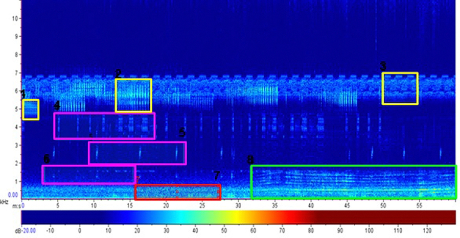 Foi notado que algumas fontes sonoras ocupavam constantemente determinadas faixas de frequência, como exemplo os anfíbios costumavam ocupar a faixa entre 2 e 8 kHz, o som do vento, a faixa até 1 kHz, normalmente, e motocicletas ocupavam entre 0,5 e 2 kHz, aproximadamente.
