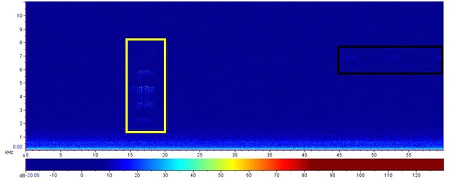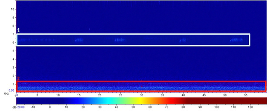 Ao observar a Figura 15, na qual há o espectrograma da paisagem acústica da Restinga do Foguete, às 14:40h do dia 21 de setembro de 2018, é possível identificar duas assinaturas bioacústicas, em que aos 15 - 20 segundos, na faixa entre 2 e 8 kHz há a biofonia de uma ave e entre 45-60 segundos, na faixa 6,5-7 kHz há a assinatura de um inseto, que não foi possível ser identificado, e que, no entanto, apareceu diversas vezes em outros espectrogramas do mesmo local.