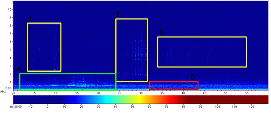 Na Figura 16, no dia 22 de setembro de 2018, às 17:25h, na Restinga do Foguete, foram identificadas ao menos três assinaturas biofônicas (itens 1, 2 e 3) e uma motocicleta foi identificada até os 25 segundos, aproximadamente, na faixa de 0,5-2 kHz (item 4). Na Figura 17 pôde ser verificada a presença de uma espécie de ave na faixa entre 3 e 7 kHz e a assinatura de um helicóptero, na faixa até 1,5 kHz, no espectrograma do dia 23 de setembro de 2018, às 05:15h, na Restinga do Foguete.