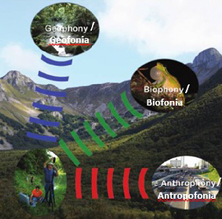 A geofonia trata dos sons naturais do ambiente, como a chuva caindo num rio, o vento mexendo as folhas das árvores, som de trovoadas etc., enquanto a antropofonia é constituída por sons produzidos por objetos construídos pelo homem, como exemplo dos veículos automotores. A biofonia está relacionada aos sons produzidos pelos animais, como insetos, aves e mamíferos (PIJANOWSKI et al., 2011b) representando funções biológicas diversificadas (BLUMSTEIN et al., 2011; PIJANOWSKI et al., 2011b; VIELLIARD, 1987): defesa do território; reprodução; localização de alimentos; comunicação; dentre outras.