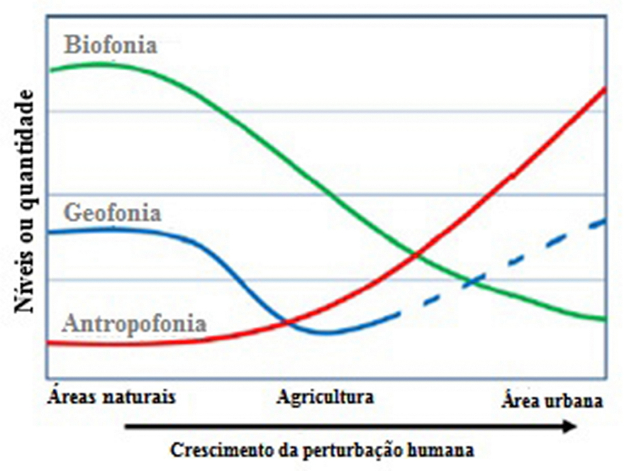 Pijanowski et al. (2011b) elaboraram um modelo conceitual acerca da possível relação entre os elementos da paisagem acústica. Como pode ser visualizado na Figura 2, os distintos ambientes apresentam diferentes níveis de ruído antrópico, e quanto mais elevado o nível dessa antropofonia, menor é o nível da biofonia.