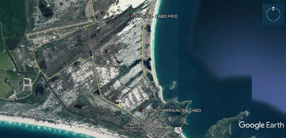 O estudo de caso foi realizado a partir de dados obtidos em remanescentes de restinga ainda preservados nos municípios de Arraial do Cabo e Cabo Frio (Figura 3), localizados na região das Baixadas Litorâneas do Estado do Rio de Janeiro, apresentando superfícies planas e sedimentos não consolidados gerados a partir da transgressão e regressão marinha que ocorreram no período Quaternário (CPRM, 2000). Essas áreas possuem características geomorfológicas e condições climáticas determinantes para a formação da vegetação, mais especificamente a vegetação de restinga, que é definida pela Resolução do Conselho Nacional do Meio Ambiente (CONAMA) como: