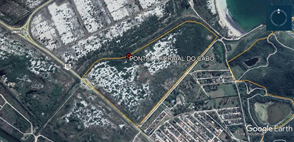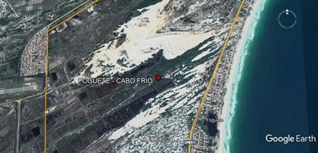 As áreas de estudo possuem vegetação arbustiva aberta, com adensamento urbano à aproximadamente 500 m de distância, em média; à 57 m de distância, aproximadamente, de salinas desativadas; em torno de 487 m das rodovias e ambos locais são margeados por corpo hídrico. O fragmento localizado na Restinga do Foguete também se encontra à aproximadamente 1,5 km do Aeroporto Internacional de Cabo Frio. As duas áreas de estudo podem ser melhor analisadas nas Figuras 4 e 5.